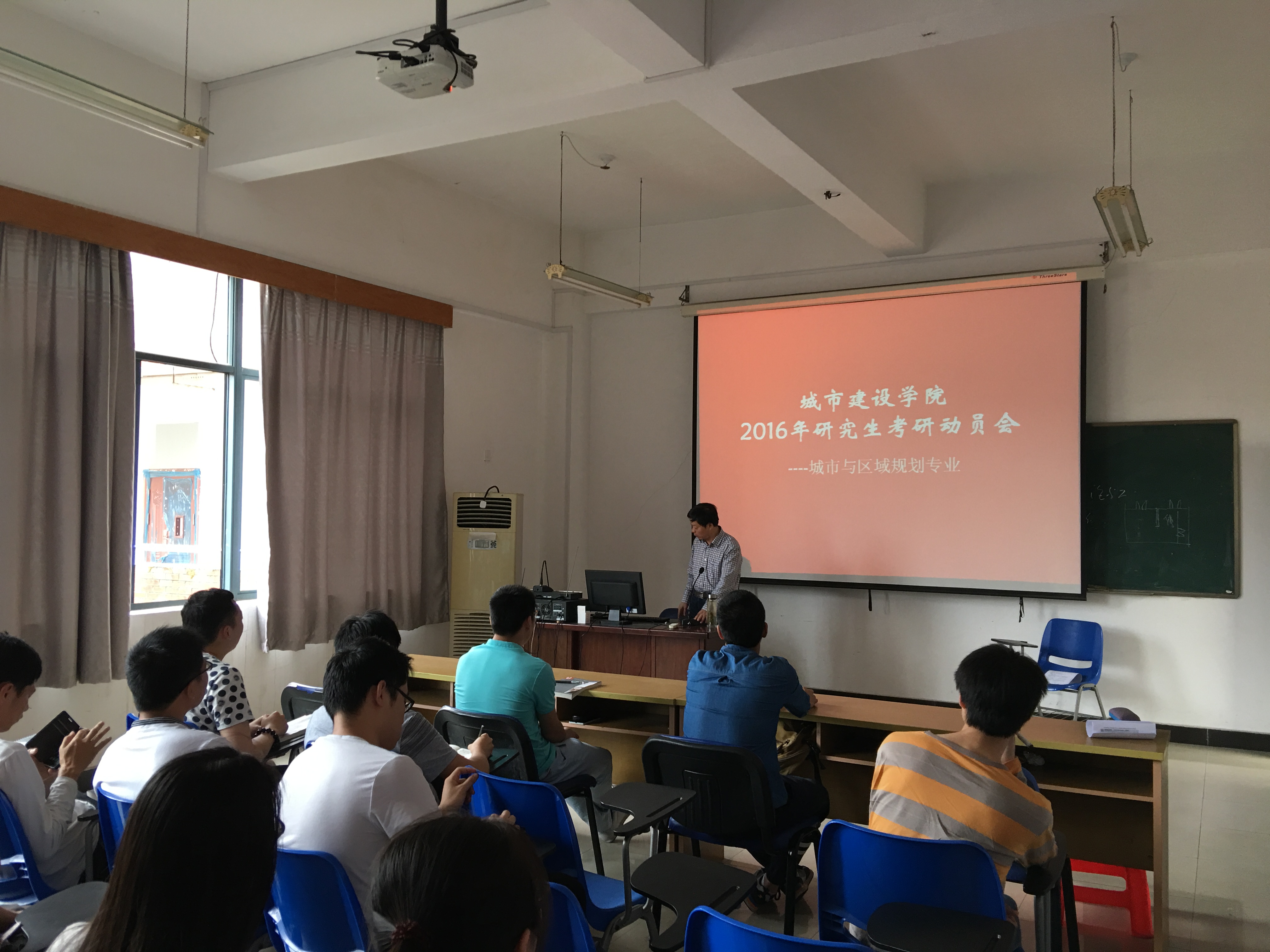 为贯彻落实学校关于2017年研究生招生宣传工作的总体部署,我院于2016年5月18日下午在一楼报告厅召开城市建设学院城市与区域规划专业的招生宣传动员大会。大会由院长闵忠荣主持,在动员会上介绍了城市与区域规划、现状、师资队伍、专业方向以及学生就业情况,并且介绍了报考本校研究生的各种奖励政策。