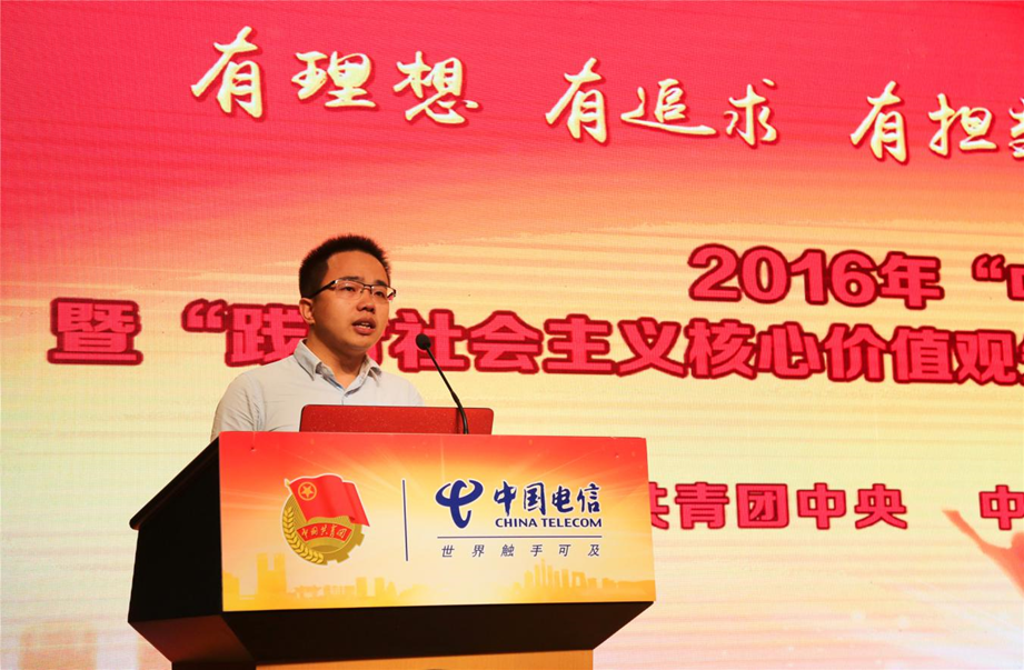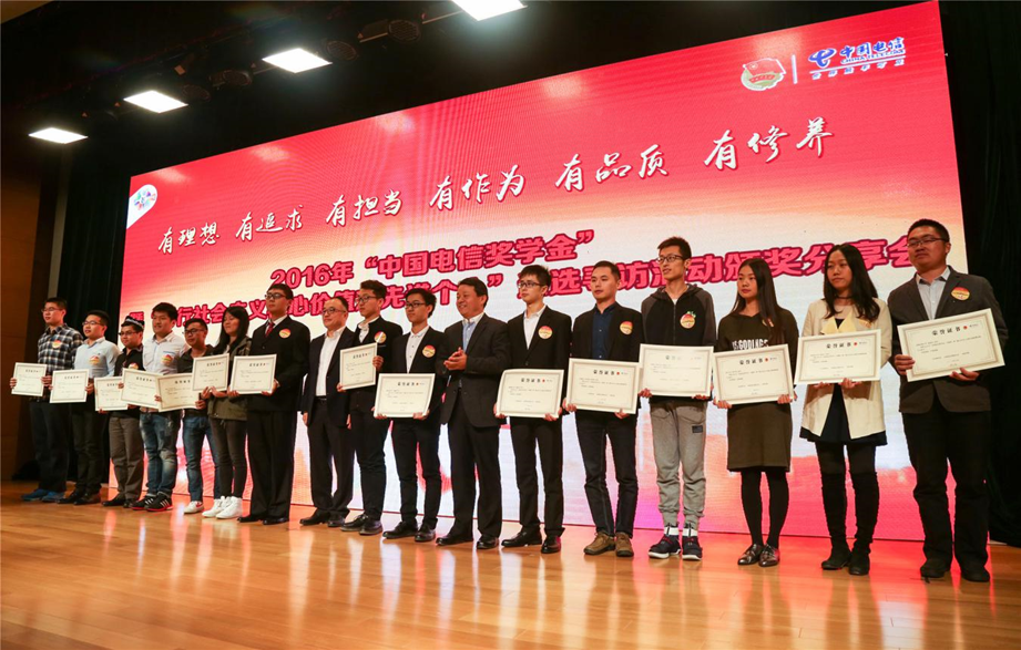 10月9日,由共青团中央、中国电信集团公司、全国学联共同主办的2016年“中国电信奖学金”暨“践行社会主义核心价值观先进个人”遴选寻访活动颁奖分享会在中国人民大学举行。团中央书记处书记傅振邦、中国电信集团公司副总经理高同庆、全国学联主席王圣博及团中央学校部、中国人民大学相关负责人出席活动并为获奖学生代表颁奖,50名获奖标兵和200余名首都各界青年大学生代表参会。