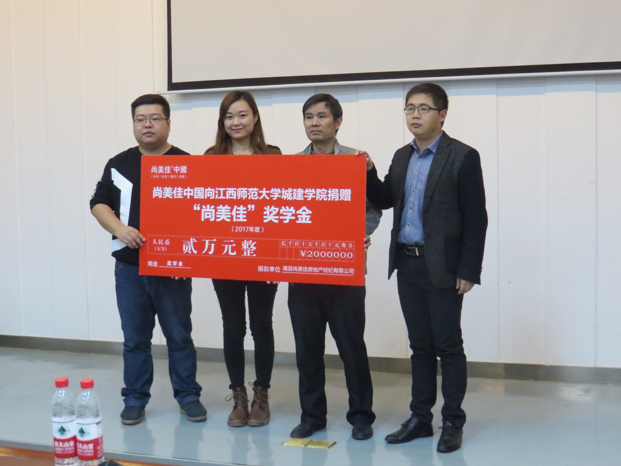 2016年11月19日下午16:30,南昌尚美佳在城建学院一楼报告厅举行了“尚美佳奖学金”设立仪式,定向用于奖励江西师范大学城市建设学院工程管理和房地产开发与管理等专业在校优秀学生,2017年度奖学金总金额为2万元,具体奖励方案另行制定。