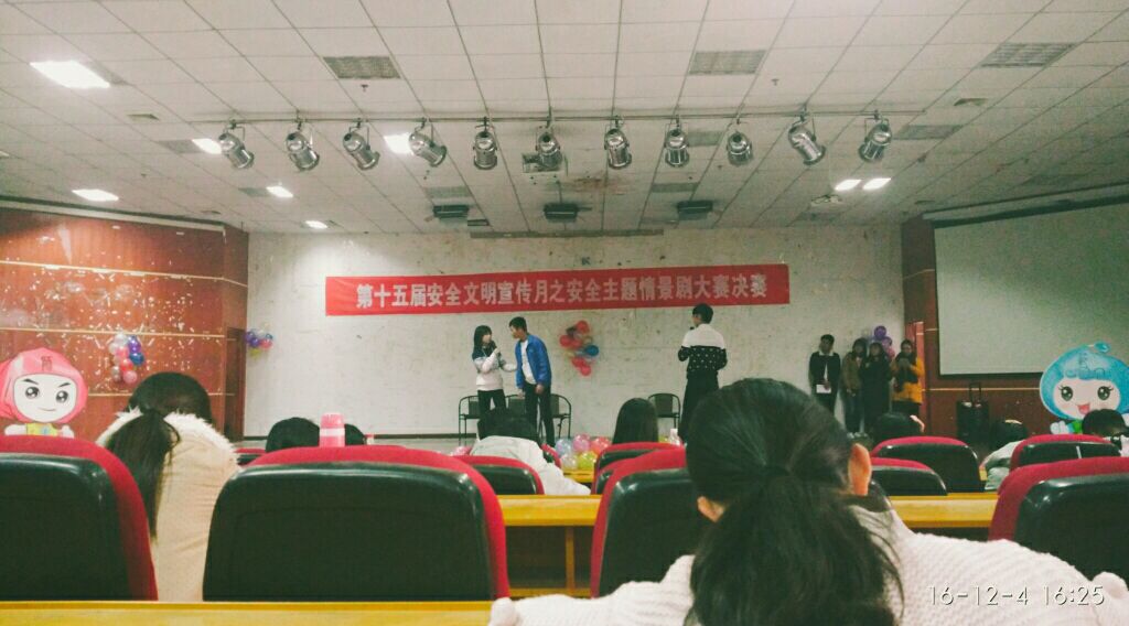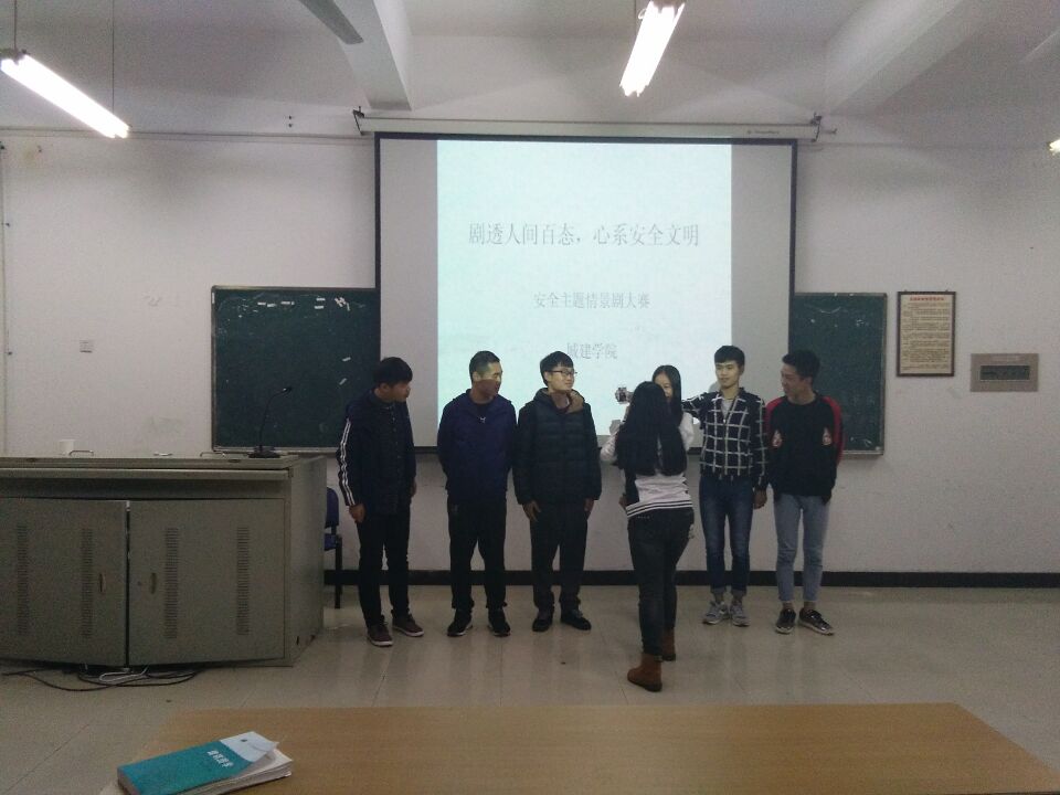 12月4日中午12点50分,由校自律部主办的“安全情景剧比赛”在大学生活动中心三楼多功能厅举行。全校共十六个节目参加竞选,校自律部及其他部门的部长作为评委。城市建设学院16级工程管理班及房地产开发与管理班以《文明怎么了》《传销组织几日游》两个节目参加了本次比赛。