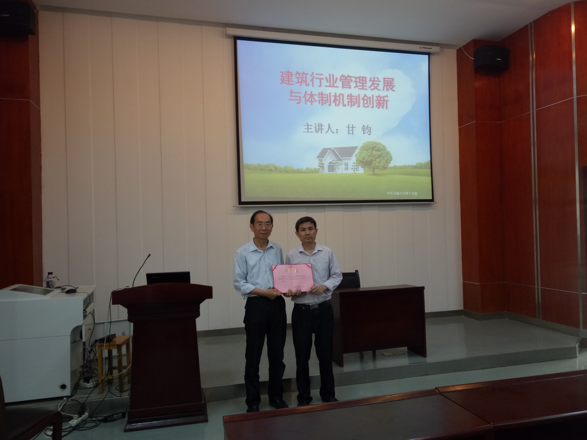 讲座开始前,城市建设学院范正根副院长代表学院聘请甘钧会长为城市建设学院客座教授。讲座伊始,甘会长向同学们介绍了建筑业的发展与改革。随后,在建筑施工队伍的发展方面,甘会长讲述了我国施工队伍的形成与发展以及我国建筑施工企业的建立与发展,让同学们对建筑行业管理有更深层次的认识。紧接着,甘会长介绍了建设设计体制创新和建筑施工体系创新,重点讲述了建筑企业管理发展方向。讲座接近尾声,甘会长与在座同学们进行了互动,告诫同学们在校要认真学习,对自己的文凭负责,不可以白拿文凭。同时,甘会长就考公务员这个问题给在座同学提出了重要的建议,鼓励大家认真对待、规划未来人生。 建筑行业管理是城建学院乃至江西师大着重建设的专业发展方向,通过甘钧会长的讲解,同学们认识到建筑行业的发展历程以及未来的发展趋势,更重要的是明确了未来自身的奋斗方向与目标。