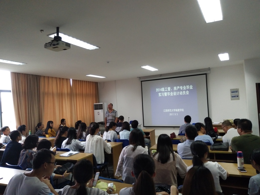 2017年9月5日下午3点半,城建学院工程管理系在新办公楼北306教室举行了2014级工管、房产专业毕业实习暨毕业设计动员会。出席本次会议的有系主任曾文海及张东祥、刘群红、胡细英、丁川等十余位指导老师及团委辅导员、14级工程管理专业和房地产开发与管理专业全体学生等。会议由任艳胜老师主持。