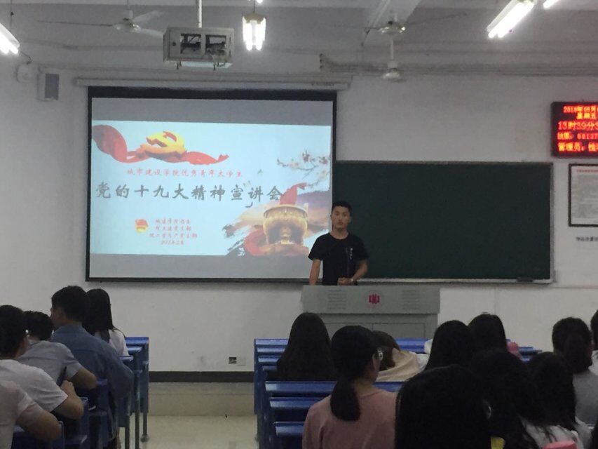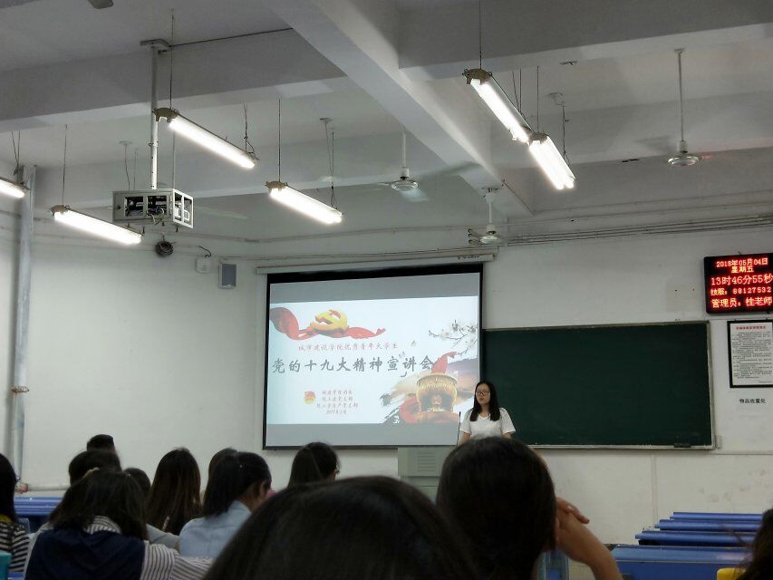 五月,是青年的五月,五月,是激情燃烧的五月。为进一步展现城建学子积极学习党的十九大精神,争做“忠于祖国忠于人民,新时代的奋进者实干家”的良好精风貌。5月院城建学院团委联合学生党支部在广大青年学子中 开展“城建学院优秀青年大学生党的十九大精神宣讲会”,选拔本学期党的发展对象和学生会主要干部利用课前15分钟,对广大同学进行学习十九大精神的宣讲。同学们用自己的所学、所思,激荡起城建学院青年学子学习宣传贯彻十九大精神热潮。