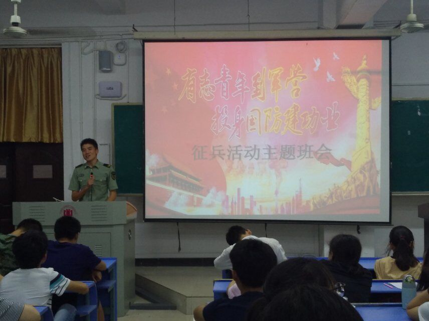 为进一步做好征兵宣传、咨询工作,积极响应省征兵办工作要求,将征兵有关政策宣传到每一位在校大学生 ,5月30日下午,武装部派出2017年退伍返校学生林卫银、董帮振于惟义楼w7401教室对城市建设学院2017级各个专业的学生召开征兵主题班会,具体地进入到班级进行以“有志青年到军营,投身国防建功业”为主题的应征入伍政策宣讲。