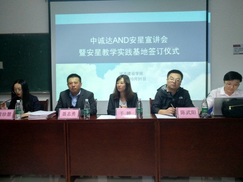 10月31日下午2点,城市建设学院党委书记黄晋邀请中诚达和安星两家企业在实验大楼北306举办宣讲会暨安星教学实践基地签订仪式。相关企业负责人聂志勇、于婷,城市建设学院党委副书记陈武阳,院团委负责人黄珍慧以及2018级工程管理、房地产开发与管理班全体同学参加了此次签订仪式。