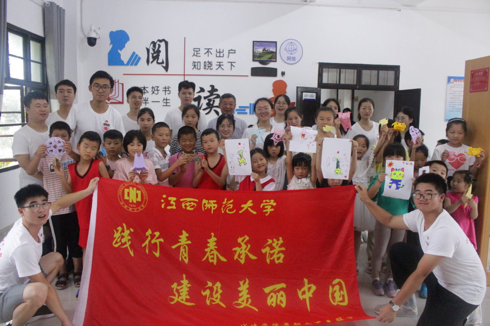 为深入学习贯彻习近平新时代中国特色社会主义思想,关爱留守儿童。2019年7月13日,江西师范大学城市建设学院 暑期三下乡社会实践服务队在共青城市甘露镇综合文化站举办“七彩课堂”活动。赣江新区党群工作部团处、宣传统战处处长陈金富、赣江新区党群工作部新闻中心主任张雁,江西广电网络直属分公司总经理南方、江西广电网络九江分公司党委书记张桂芳一行人来到甘露镇综合文化站进行参观,与队员们进行了深度交流并对七彩课堂活动进行了高度评价。