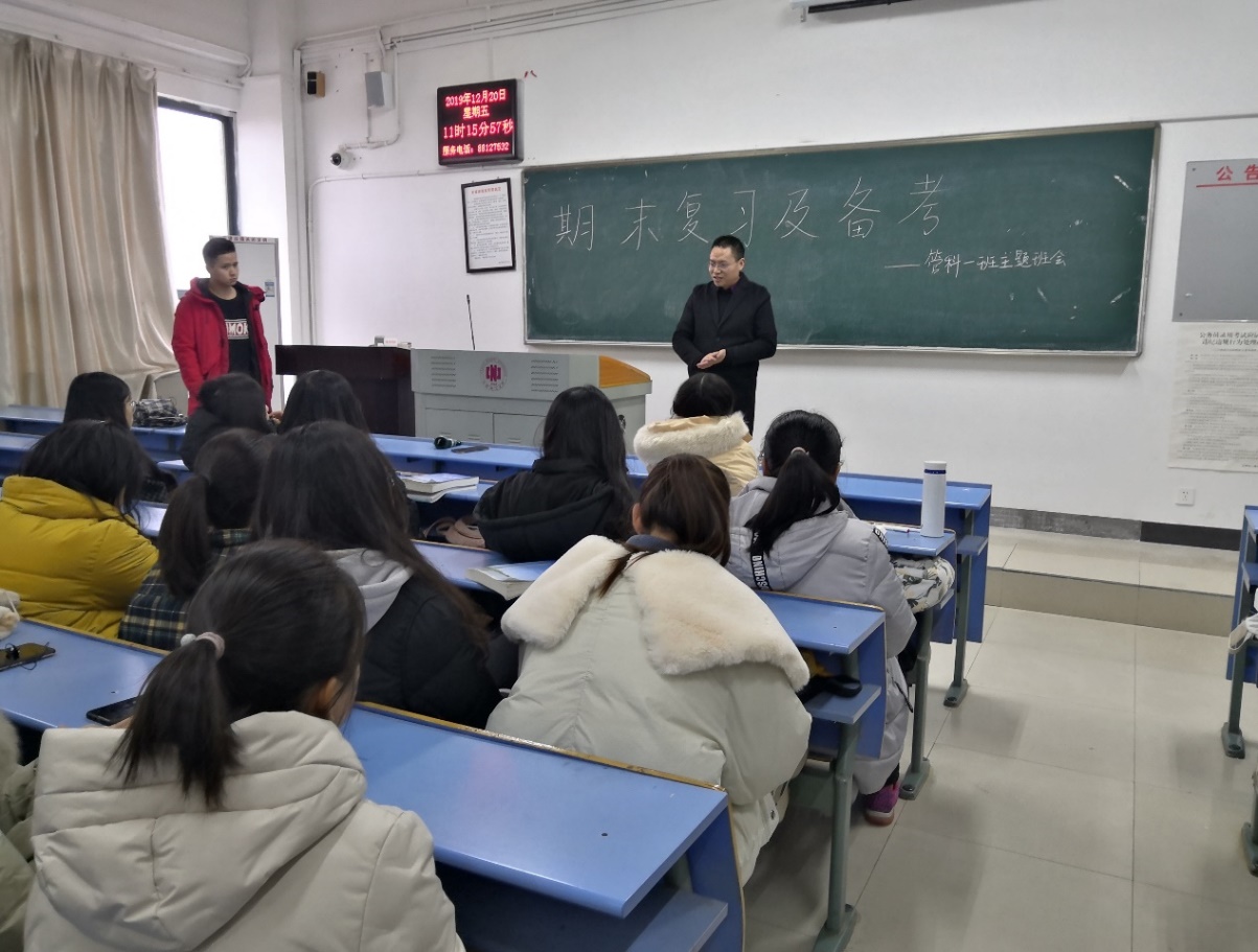 本学期的学习生活已接近尾声,期末考试临近,为了严肃考风考纪,高效复习考试,树立良好的学风考风,2019年12月20日上午11点10分,19级管理科学与工程类1班在W4501教室开展了的主题班会。