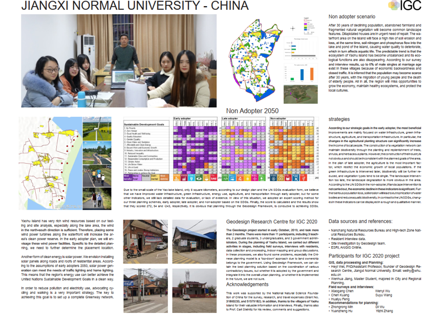 IGC (International Geodesign Collaboration)国际会议是由美国哈佛大学Steinitz教授、明尼苏达大学Fisher教授和佐治亚大学Orland教授共同发起,由美国ESRI公司提供支持,皆在全球范围内实现Geodesign规划框架在不同地理尺度中的项目应用。2020于2月22-24日,IGC在美国加利福尼亚Redlands(ESRI总部)举行Geodesign项目应用大会,本次会议参加人员涉及全球范围内的15个国家/地区和几十余所参与单位/高校。会场共展示33个应用项目(Project),根据组委会的分类,我院研究团队递交的“Jiangxi Normal University:Geodesign Regulates the Biodiversity Protection and Resident Demand”是大中华区唯一的大尺度(Largest Projects)项目。