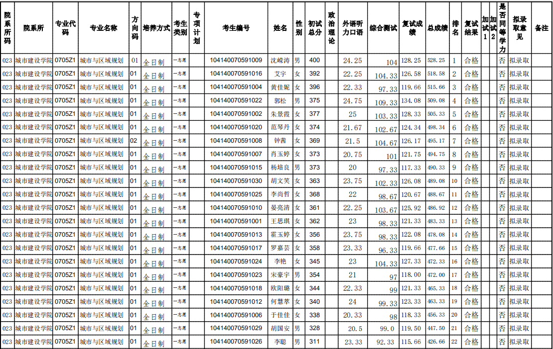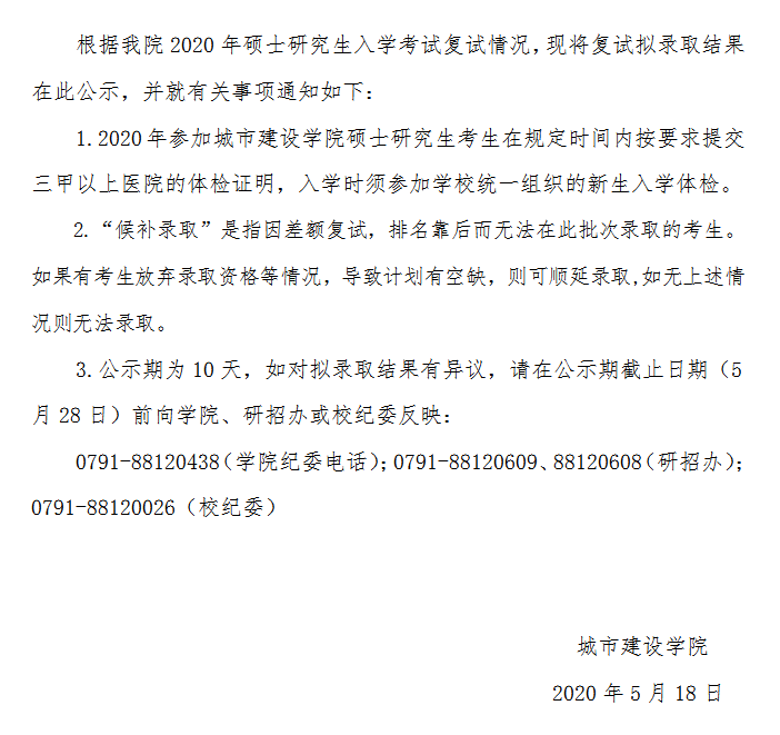 城市建设学院2020年硕士研究生入学考试复试结果公示