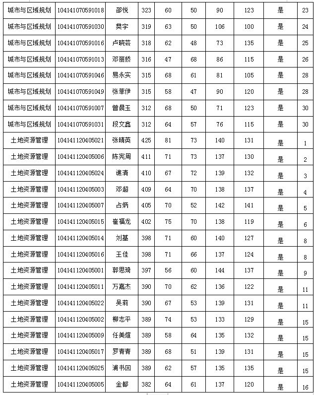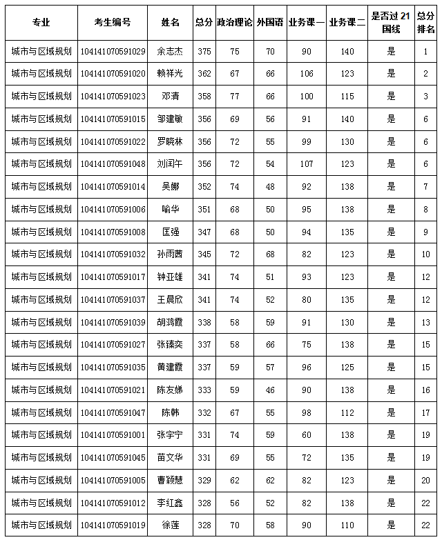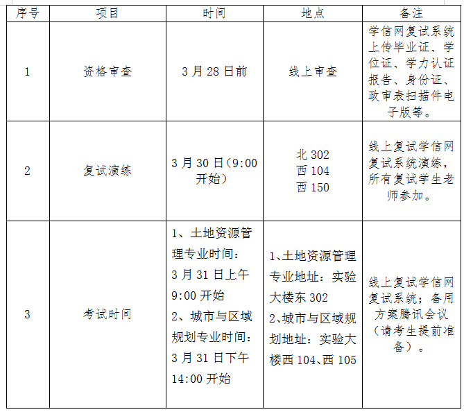 二、各专业(方向)招生计划、复试分数线 ![]() 三、复试录取工作原则 1.坚持科学选拔。积极探索并遵循高层次专业人才选拔规律,采用多样化的考察方式方法,确保生源质量。 2.坚持公平公正。做到政策透明、程序公正、结果公开、监督机制健全,维护考生的合法权益。 3.坚持全面考查,突出重点。在对考生德智体等各方面全面考察基础上,突出对专业素质、实践能力以及创新精神等方面的考核。 4.坚持客观评价。业务课考核成绩应量化,综合素质考核也应有较明确的等次结果。 5.加强诚信评判。要切实将诚信考核作为专项环节纳入复试工作,强化对考生诚信的要求。 6.坚持以人为本,增强服务意识,提高管理水平。 四、复试 (一)考生进入复试的基本条件 1.在国家确定的初试成绩基本要求基础上,结合生源和分专业招生计划等情况,我院划定复试的初试成绩基本要求: 城市与区域规划专业复试分数线312分; 土地资源管理专业复试分数线382分。 2.所有考生(推荐免试生除外)均须参加复试,复试合格后方能录取。 3.采取差额复试的办法。专业复试比例为1:1.2;调剂生复试比例不低于1:1.5。 4.如一志愿生源不足,通过调剂补充生源。调剂生复试的调剂条件和调剂复试录取程序按照教育部关于印发《2021年全国硕士研究生招生工作管理规定》的通知和校文件《江西师范大学2021年硕士研究生复试录取工作方案》执行。 (二)考生复试资格审核 复试前,须按照教育部和本单位已公布的当年《招生简章》相关要求对考生复试资格进行审查,审查内容包括: (1)初试准考证(中国研招网可下载); (2)身份证件; (3)应届本科毕业生须提供《教育部学籍在线验证报告》; (4)非应届本科毕业生须提供《教育部学历在线验证报告》; (5)在境外获得的学历证书须提供教育部留学服务中心出具的《国外学历学位认证书》; (6)思想政治审查表(江西师范大学研招网可下载); (7)“少数民族高层次骨干人才计划”考生须提供《报考2021年少数民族高层次骨干人才计划硕士研究生考生登记表》; (8)报考“退役大学生士兵”专项计划考生应提供本人《入伍批准书》和《退出现役证》。 资格审查不符合要求者,取消复试资格。参加复试考生均需签订《诚信承诺书》;对有弄虚作假者一经发现随时取消复试或录取资格。 (三)复试方式 按照《教育部办公厅关于做好2021年全国硕士研究生复试工作的通知》文件精神,考虑全国疫情防控新形势,我校2021年硕士研究生复试采取远程网络复试的方式。 1.远程网络复试平台使用学信网开发的《研招远程面试系统》; 2.为保证复试过程的顺利、平稳,我院使用腾讯会议远程视频的应用软件作为辅助或应急备用远程复试平台; (四)、复试内容及考核要求 1.外语听力和口语水平测试 所有专业考生均须进行外语听力和口语水平测试,分值为30分,成绩计入复试总成绩。外语听力和口语水平测试主要测试考生的听力理解能力和运用英语知识与技能进行口头交际的能力。形式主要为英文文献阅读,现场抽题、考生朗读并回答问题,英文对话等。 2.综合测试 (1)综合素质面试 综合素质主要考核考生的专业基础知识、创新意识与能力、心理健康状况及综合素质等。 (2)专业测试 专业测试着重考核考生对专业基础理论、基本知识掌握的深度和广度。 综合测试总分120分,考查形式采取面试,抽取题签回答问题的形式进行专业测试。 综合测试应尽可能采用综合性、开放性的能力型试题,同时可要求考生提供大学学习成绩单、毕业论文、科研成果、专家推荐信等补充材料,,加强对考生既往学业、一贯表现、科研能力、综合素质和思想品德等情况的全面考查。 (1)每生时间一般不少于20分钟; (2)每个复试小组成员一般不少于5人; (3)每个专业必须提前准备足够数量的复试题签,还应对每位考生的作答情况进行现场记录,并妥存备查; (4)同一学科(专业)各复试小组的面试方式、时间安排、试题难度和成绩评定标准应统一。 3.同等学力加试 以同等学力参加复试的考生,在复试中须加试至少两门与报考专业相关的本科主干课程。加试科目不得与初试科目相同。加试的考试形式可由各硕士点自行确定。 (五)、复试时间 ![]() (六)、破格复试 不接受破格复试申请。 (七)、思想政治素质和品德考核 要严格遵循实事求是的原则认真做好考生思想政治素质和品德考核工作,对于思想品德考核不合格者不予录取。主要考核考生的政治态度、思想表现、道德品质、遵纪守法、诚实守信等方面,可以通过面谈直接了解考生思想政治情况,如有需要也可采取“函调”或“派人外调”的方式对考生的思想政治素质和品德考核。 五、体检 参照教育部、卫生部、中国残联印发的《普通高等学校招生体检工作指导意见》(教学〔2003〕3号)要求,按照《教育部办公厅卫生部办公厅关于普通高等学校招生学生入学身体检查取消乙肝项目检测有关问题的通知》(教学厅〔2010〕2号)规定,拟录取考生在5月25日前提交二甲以上医院的体检证明,入学时须参加学校统一组织的新生入学体检。 六、录取 1、总成绩核算方式 复试总成绩与初试总成绩相加为考生总成绩。 2、总成绩排名方式 录取时按照考生总成绩排序,依次录取。总成绩相同依次比较初试总成绩、初试专业课成绩、复试综合测试成绩。 3、其他要求 (1)未经复试的
