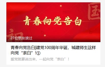 在建党100周年即将来临之际,城市建设学院在全院“线上+线下”同时举行“青春向党告白”活动,组织广大团员青年用一句话向党告白或一句话祝福党、祖国或者人民,将表白制作成视频,在学院微信公众平台进行推送,营造良好的爱党爱国氛围。