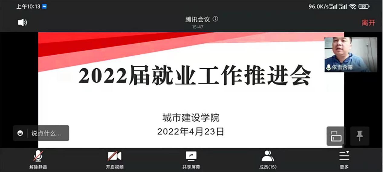 4月23日上午,城市建设学院在腾讯会议召开2022届就业工作推进会,学院班子成员、各系系主任、副系主任和毕业班辅导员参加会议。会议由党委副书记陈武阳主持。