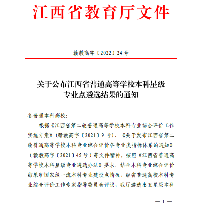 工程管理和房地产开发与管理专业于2022年06年14日,均获江西省第二轮本科专业综合评价第一名(赣教高字[2022]17 号),并于2022年07月21日,均被评为江西省五星级本科专业(赣教高字[2022]24号)。