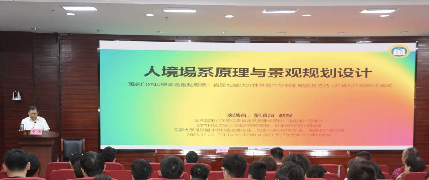 2025年9月22日下午,第八届国务院学位委员会风景园林学科评议组第一召集人、国务院学位办风景园林硕士专业学位指导委员会委员,同济大学风景园林学科委员会主任、风景科学研究所所长,二级教授、风景林学博士生导师刘滨谊教授应邀做客我校,为城市建设学院师生作了题为《“人境场系”原理与景观规划设计》的专题讲座。 讲座伊始,李志院长代表学院对刘滨谊教授的莅临致以热烈欢迎。他在致辞中强调,刘滨谊教授是我国风景园林领域的权威专家与领军学者,此次应邀到访讲学,不仅为师生带来前沿学术视角,更是学院学科建设与学术交流中的重要盛事,对推动学院相关学科发展具有重要意义。在随后的讲座中,刘滨谊教授围绕风景园林学科的前沿理论体系与景观规划设计实践,进行了深入系统的阐述。整场讲座学术氛围浓厚,刘教授以其深厚的学术造诣和丰富的实践经验,为在场师生提供了宝贵的学术启迪,激发了大家对专业领域的深度思考。