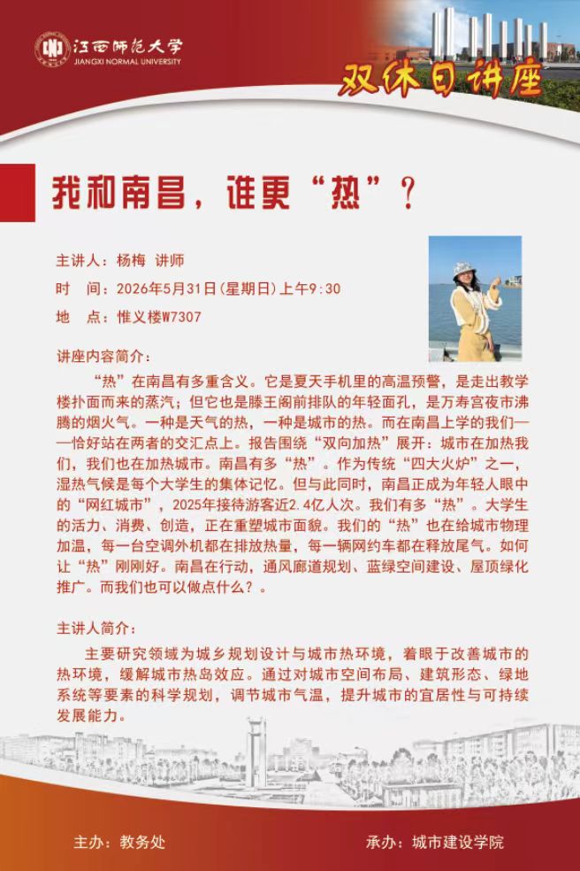 "热"在南昌有多重含义。它是夏天手机里的高温预警,是走出教学楼扑面而来的蒸汽;但它也是滕王阁前排队的年轻面孔,是万寿宫夜市沸腾的烟火气。一种是天气的热,一种是城市的热。而在南昌上学的我们一一恰好站在两者的交汇点上。报告围绕"双向加热"展开:城市在加热我们,我们也在加热城市。南昌有多"热"。作为传统"四大火炉"之一,湿热气候是每个大学生的集体记忆。但与此同时,南昌正成为年轻人眼中的"网红城市",2025年接待游客近2.4亿人次。我们有多"热"。大学生的活力,消费,创造,正在重塑城市面貌。我们的"热"也在给城市物理加温,每一台空调外机都在排放热量,每一辆网约车都在释放尾气。如何让"热"刚刚好。南昌在行动,通风廊道规划,蓝绿空间建设,屋顶绿化推广。而我们也可以做点什么?
