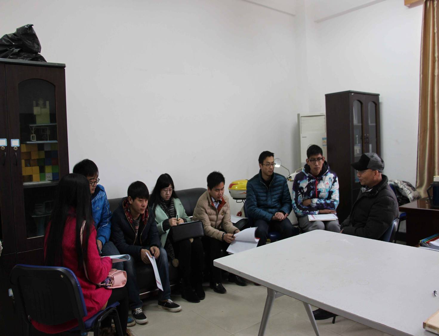 确认人员到齐后,会议于三点半准时开始。主讲老师重点就毕业设计工作的时间地点、指导老师、内容主题三项内容进行阐述,其中地点和内容可以结合同学们现阶段的实习单位与项目来选择,但必须满足几项原则要求,相关单位也需出具证明来表明项目内容及其真实性。随后老师谈到设计成果展示主要包括A3图册两份、A1展板一套、电子光盘一张等,且针对整个设计流程进行详细分步与时间限定,备注答辩具体时间另定。同学们听讲专注入神,表现出对毕业设计的高度重视。会议进入尾声,老师着重强调《毕业设计过程管理手册》填写要求、成果装订顺序等细节要求。