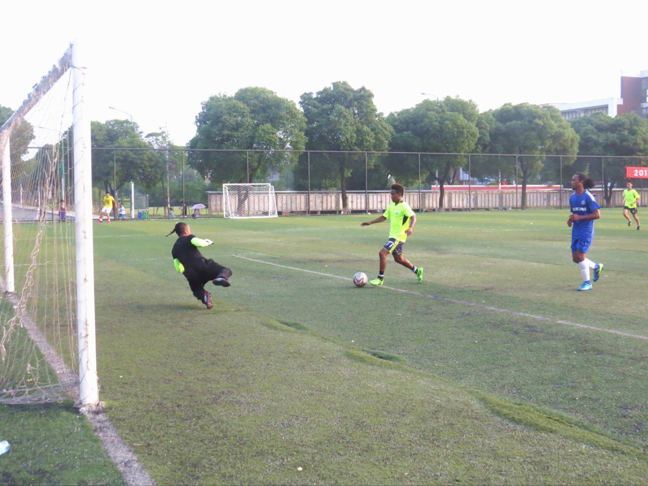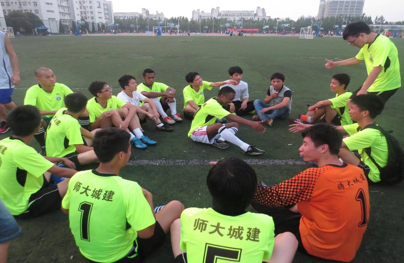 开始比赛,球场上气氛十分激烈,奔跑、抢球、带球、射门、飞扑……,每个看似简单的动作,都十分不容易。国教足球队不愧为师大强队,凭借优秀的个人能力首进一球。在比分落后的情况下,城建队员没有泄气,总结不足、互相鼓励、重新布局、积极进攻。拉拉队“城建加油,城建最强”的呐喊声此起彼伏,也极大地鼓舞城建队员的士气。在数次威胁对方球门后,由乔森破门把比分扳平,上半场定局1比1。