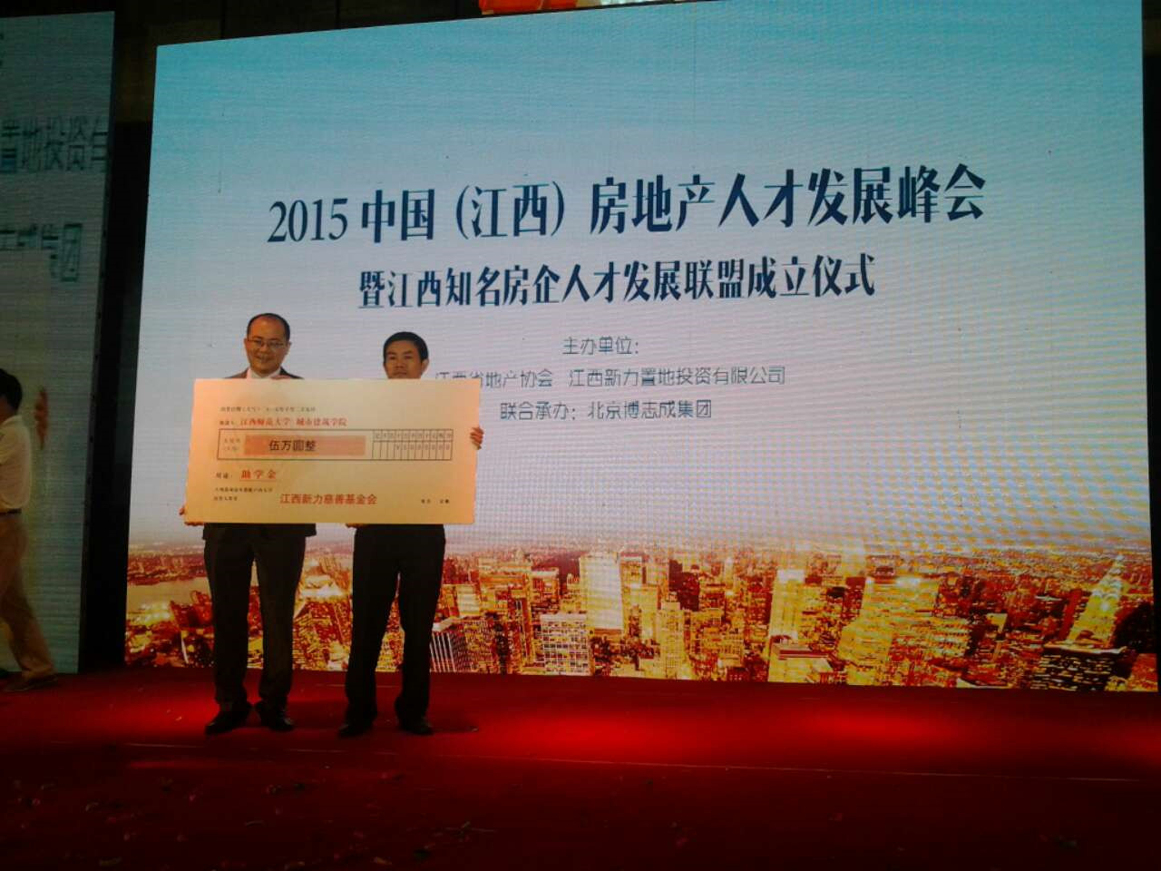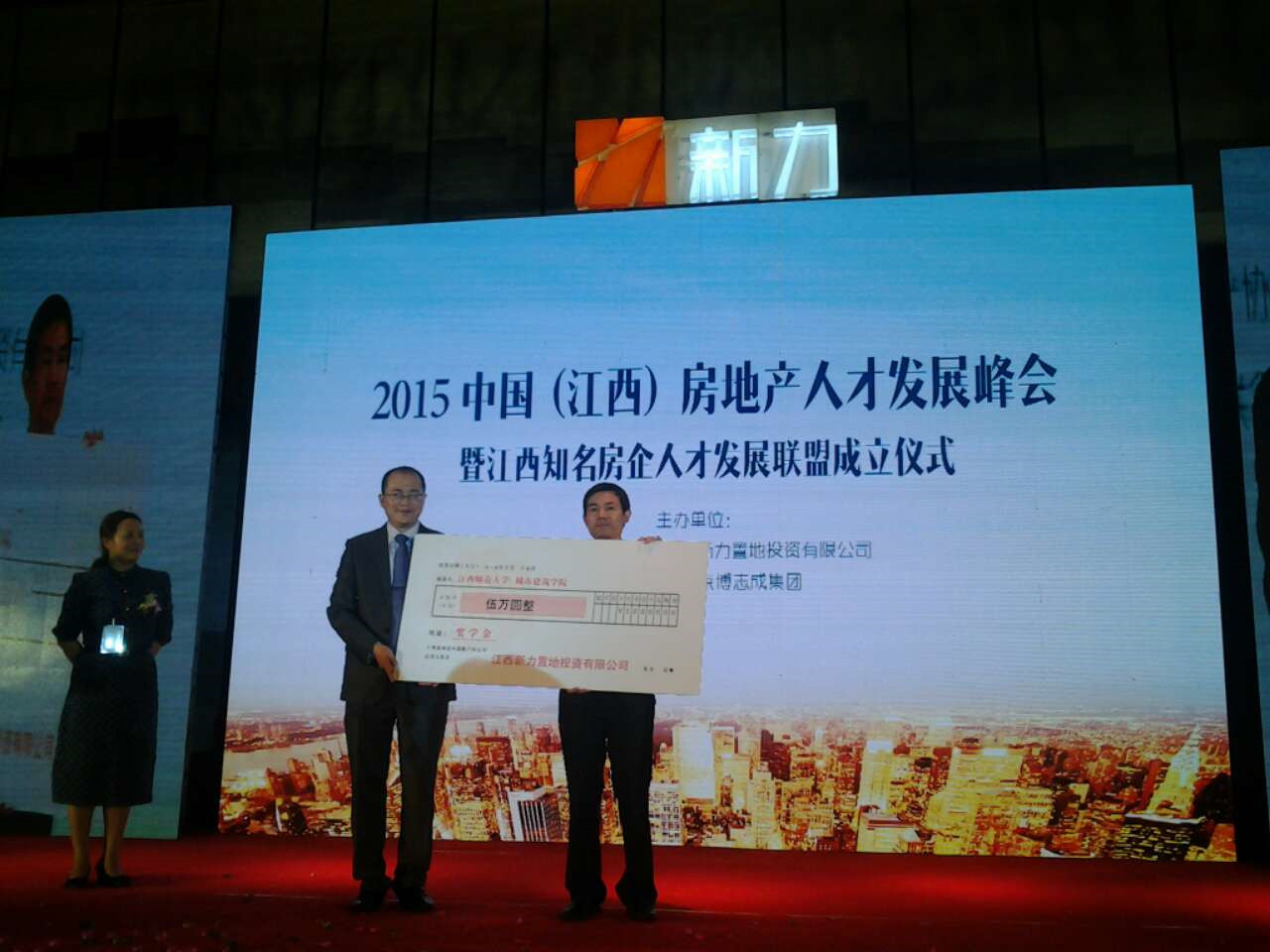 2015年10月25日下午,新力置地在万达嘉华酒店举行江西房地产人才发展峰会,晚上举行了奖助学金捐赠仪式,2015年度捐赠江西师大城建学院10万奖助金,其中新力置地“新力量”奖学金5万、“新力公益基金会•助学金”5万。这是我院第一个企业基金,开创了我院企业基金新局面。