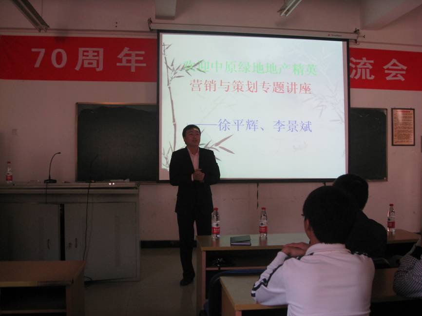为联络校友,加深感情,加强学生就业工作和人才培养工作。2011年11月13日,在工程管理系范正根主任、刘群红教授、学工负责人黄志刚和部分辅导员的协助下,城建学院地产财富社成功组织了本学期第一次 “校友专题讲座”活动,被邀请的校友为上海绿地集团南昌事业部营销总监李景斌(00房地产)和江西中原地产经纪有限公司事业一部总经理徐平辉(00房地产)。全院各年级近200余名同学参加了学术讲座。